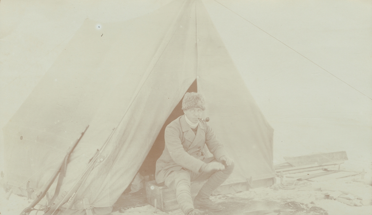 Fotografi från expedition till Spetsbergen. Motiv av man med pipa sittande utanför ett tält.