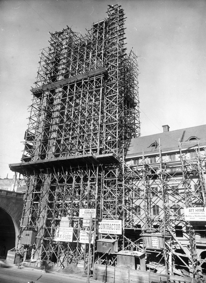Byggherre: Byggnadsaktiebolaget Contractor. Stockholms första skyskrapa undert uppförande med skylten "Att hyra".