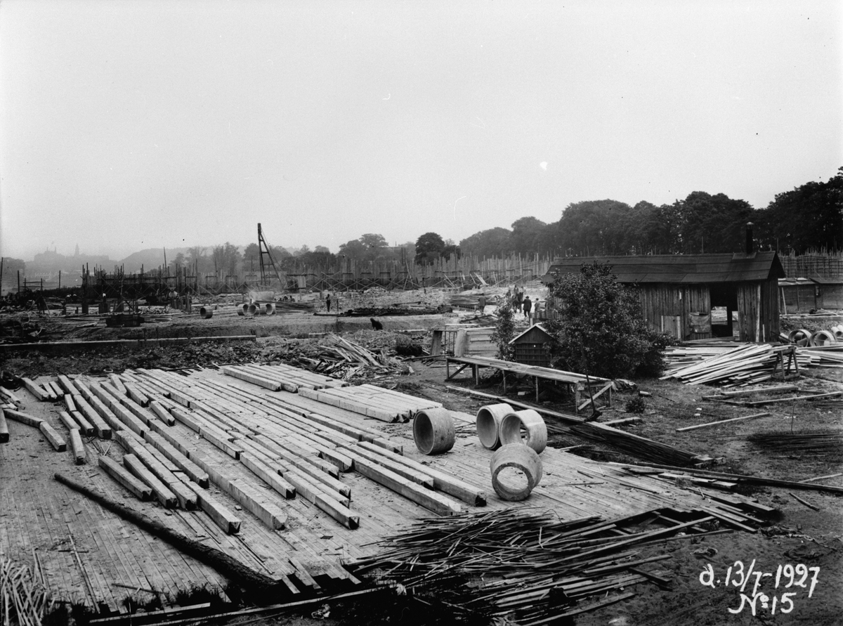 Byggherre: Bygnadaktiebolaget Contractor, Stockholm. General Motors Nordiska AB:s första fabriksbyggnad i Sverige. Arbetsbild. Hammarbyhamnen 1927.