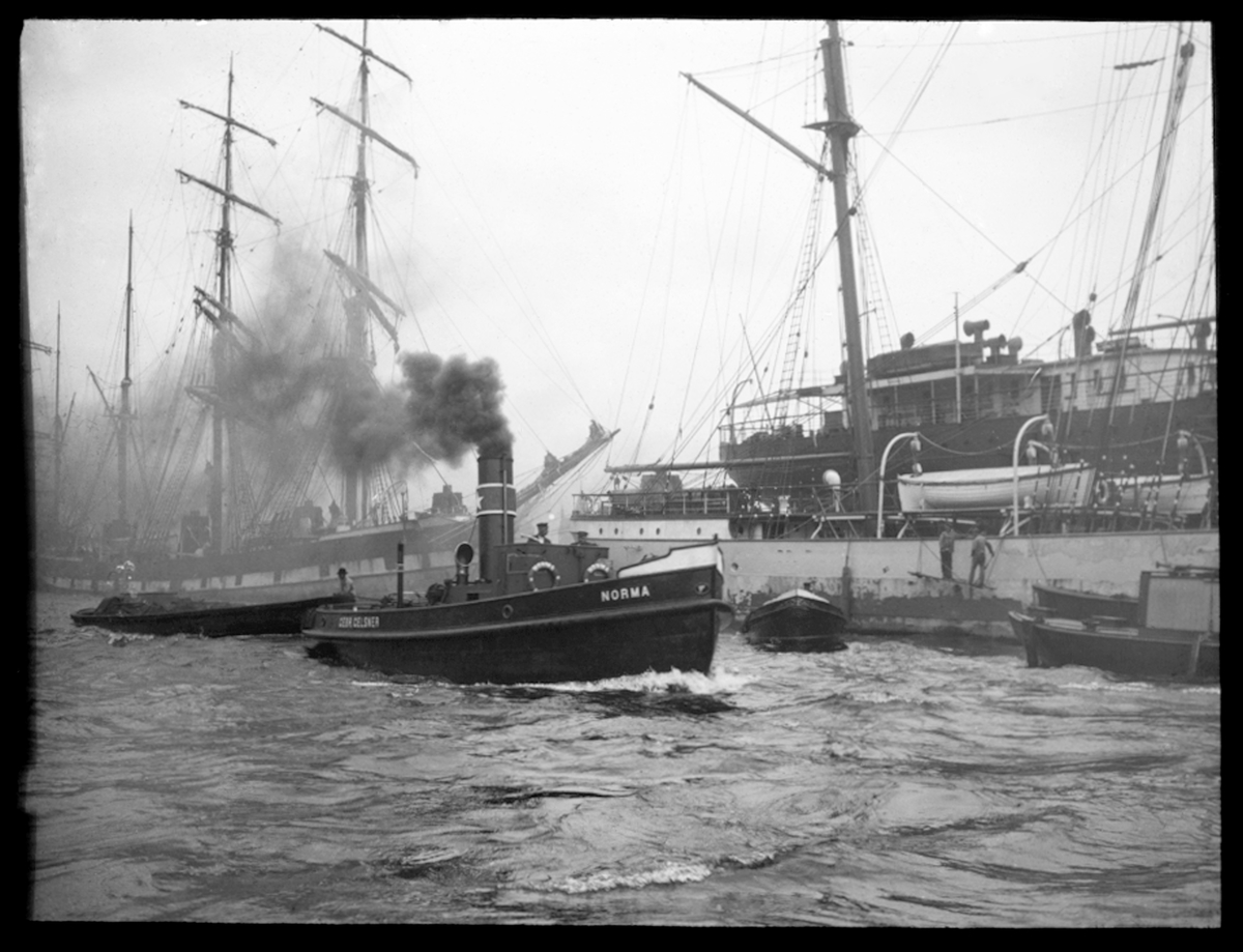Skioptikonbild från institutionen för fotografi vid Kungliga Tekniska Högskolan. Motiv föreställande ångfartyg (Norma) med annat fartyg i bakgrunden