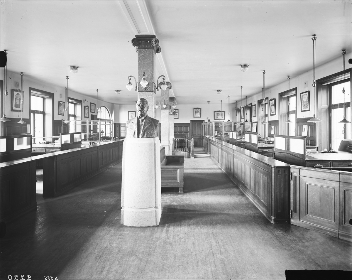 Affärskontor, med skulptur föreställande dir E A Bolinder.
