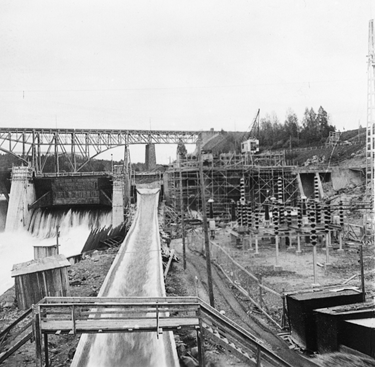 Forsmo kraftverk. Kraftverksbygge och bro över vattenränna.