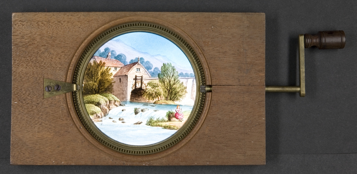 Laterna magica bild målad i färg på glasskiva.