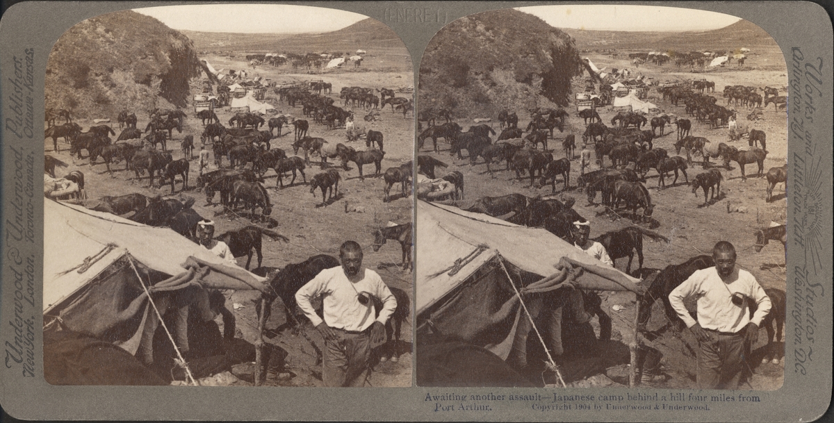 Stereobild av hästar i Japanskt läger, bakom kullarna, Port Arthur.