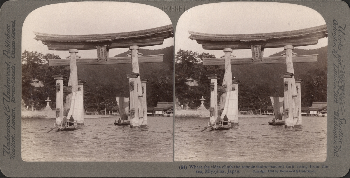 Stereobild av segelbåtar invid tempeltrapporna i tidvattnet, Miyjaima.