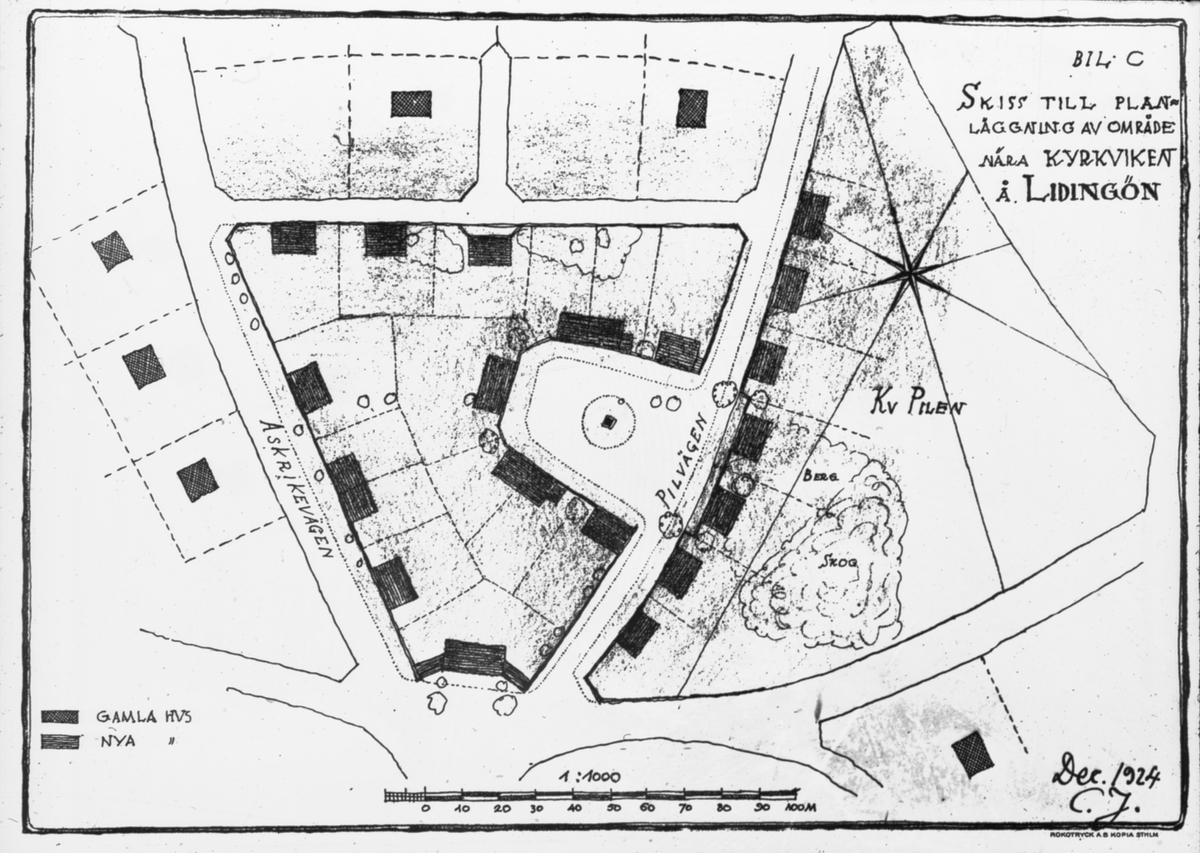 Planläggningsritning, bostadsområdet, Kyrkviken, Lidingö.