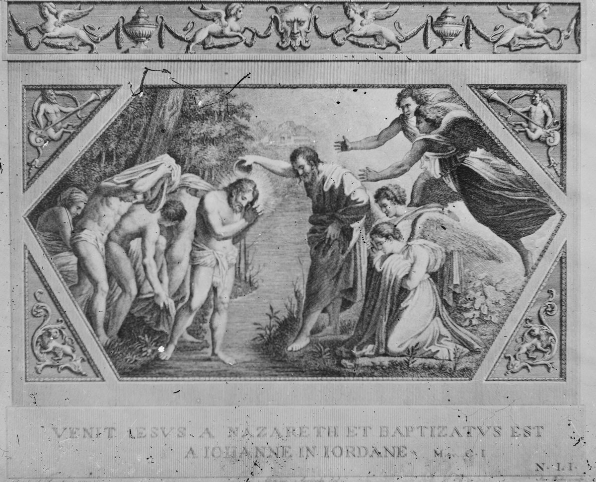 Skioptikonbild. Tryck. Jesus kom från Nasaret i Galileen och blev döpt av Johannes i Jordan.