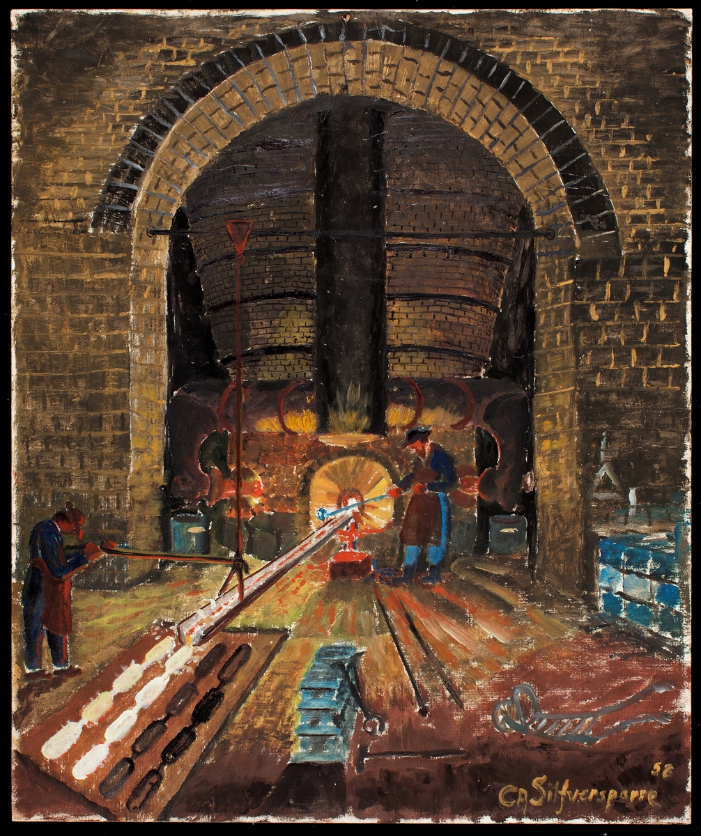 Oljemålning med motiv av masugnsutslag i Bofors. Målning ur minnet av Carl A. Silfversparre.