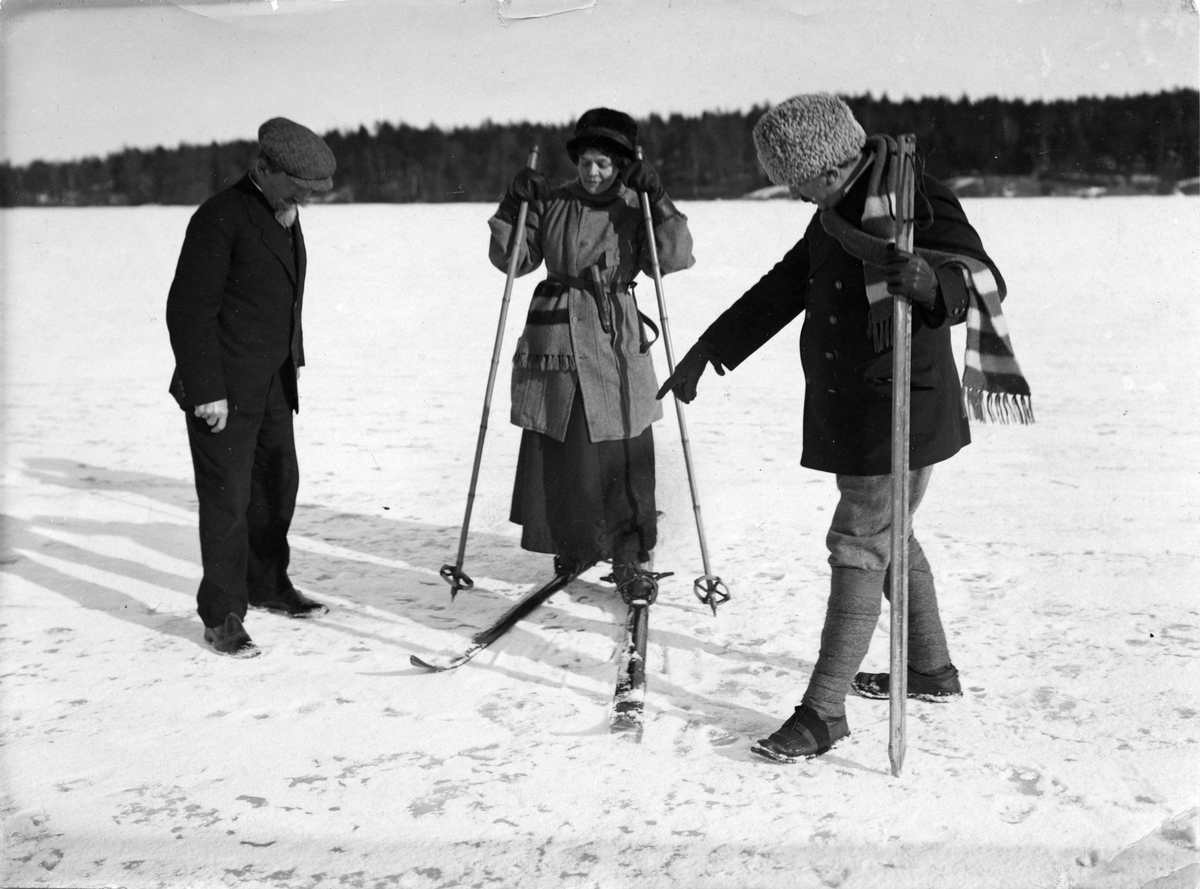 Carl Richard Nyberg, kallad Flyg-Nyberg (längst till vänster i bilden), tillsammans med Malin Ödmann och kapten John Nerén på isen vid Täcka udden i jan. 1919. Bilden lämnad till Tekniska Museet av fru Greta Broberg, Stockholm, genom filmhistoriska samlingarna jan 1952.
