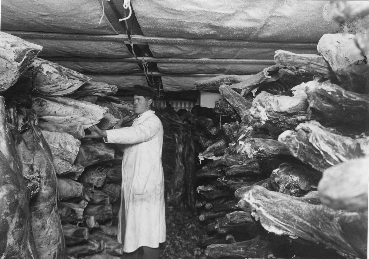 Fryshus för nötkött inrymt i provosoriska lokaler i AB Svenska Tobaksmonopolet, Götgatan 48. Staplat nötkött. Anläggningen var färdig 1917.