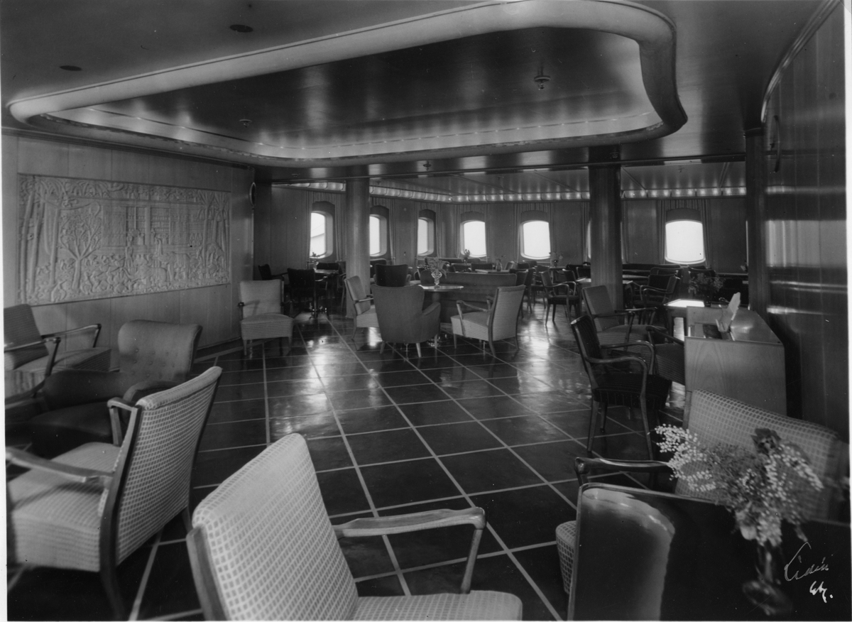 Sällskapsrum, turist klass, ombord på fartyget M/S Stockholm vid Svenska Amerika Linien. Panel: Rödbok. Tak: målat ljust. Möbelklädsel: omväxlande blåa och samma färg som panelen. Gardiner: Randiga i samma färger som möbelklädseln. Trärelief utförd av skulptören Robert Nilsson.