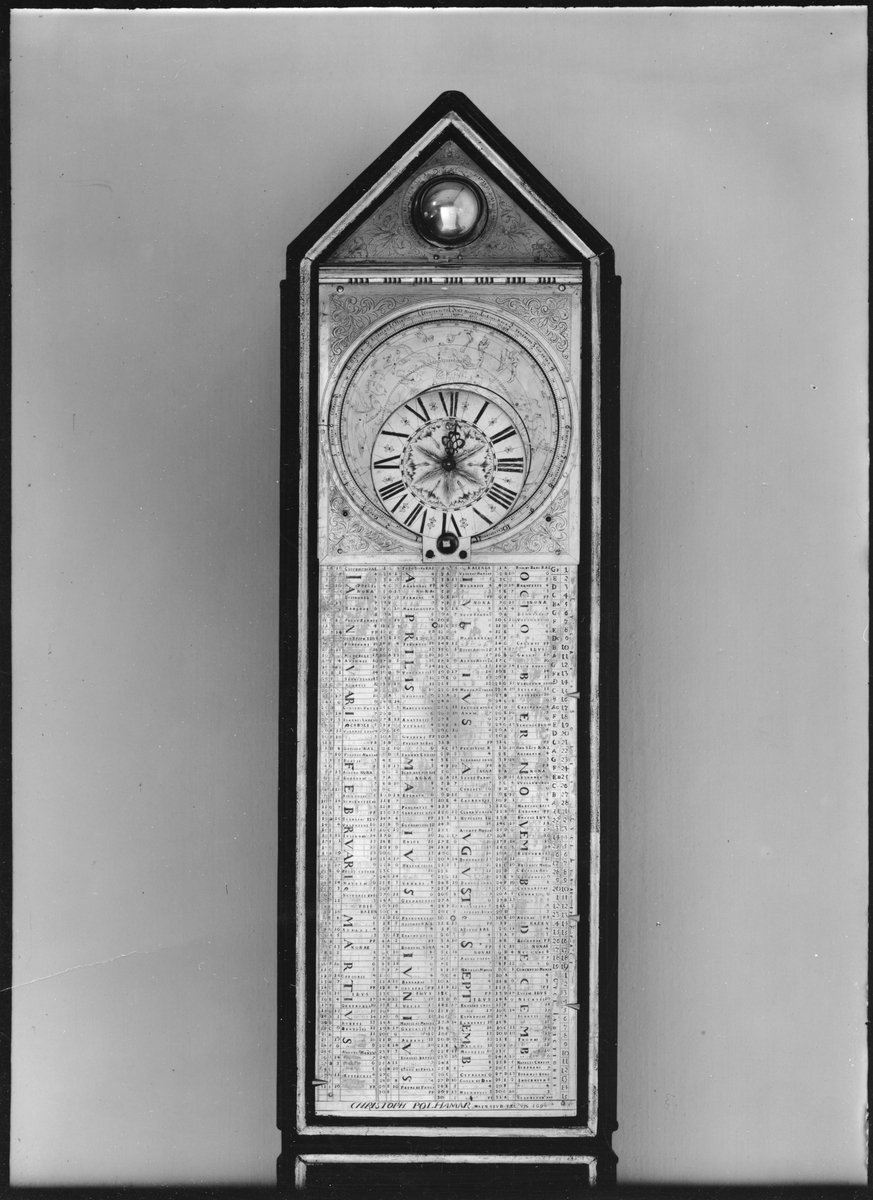 Christopher Polhems astronomiska ur i sitt fodral av svartmålat furu.