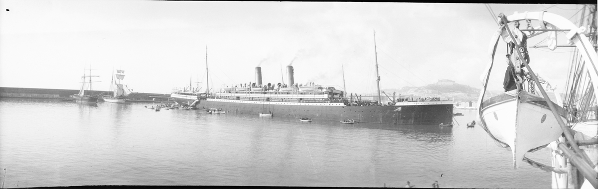 Drottning Victorias bilder. Fartyg i hamnen i Neapel. I bakgrunden syns siluetten av Castel Sant'Elmo.