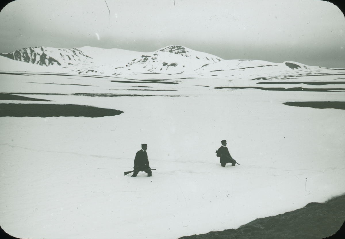 Fotografi från expedition till Spetsbergen. Motiv av två män med gevär som vandrar i djup snö.
