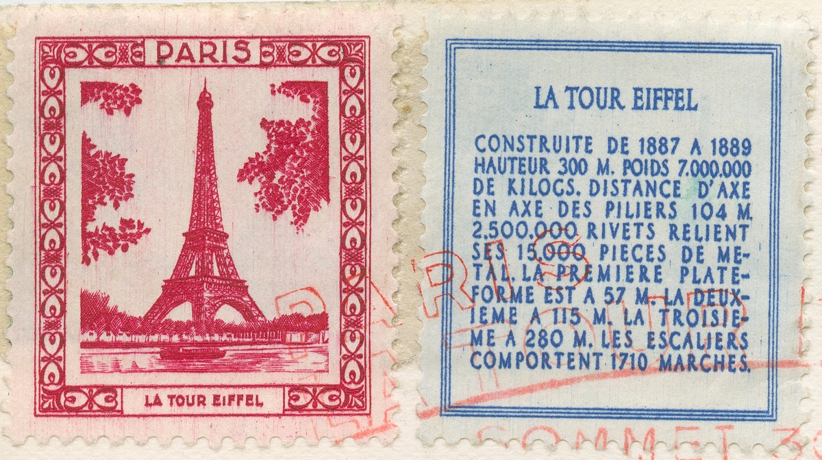 Frimärke från Frankrike, 1953. Motiv av Eiffeltornet, "La Rour de Eiffel" i Paris, ett reklammärke med speciell stämpel för besök uppe i Eiffeltornet. På ett vykort med L'Arc de Triomphe.