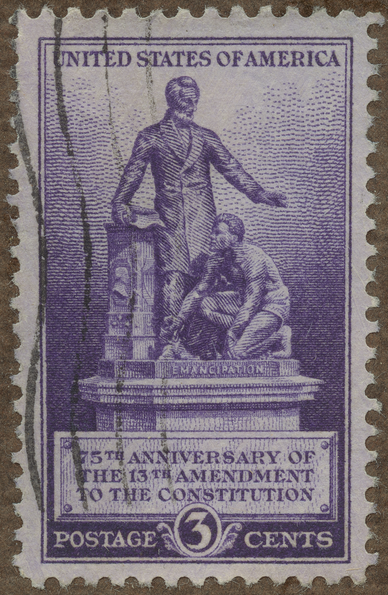 Frimärke från U.S.A., 1940. Motiv av Monumentet "Emancipation" av Tomas Ball över Abraham Lincoln som befriar en afroamerikansk slav. 75-årsminne av slaveriets avskaffande: 1865-1940