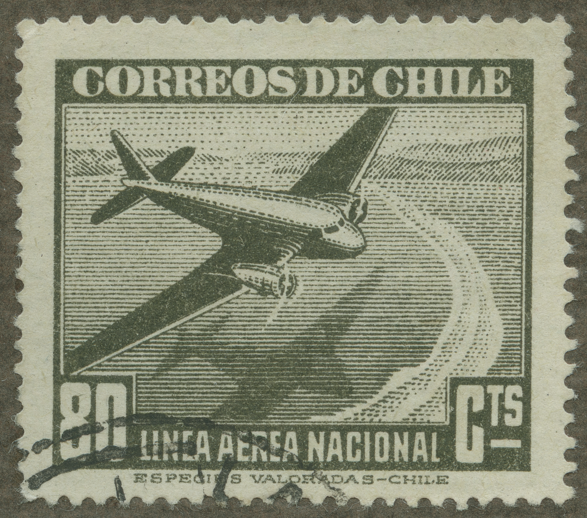 Frimärke från Chile, 1942. Motiv av Tvåmotorigt postflygplan Linea aerea nacional