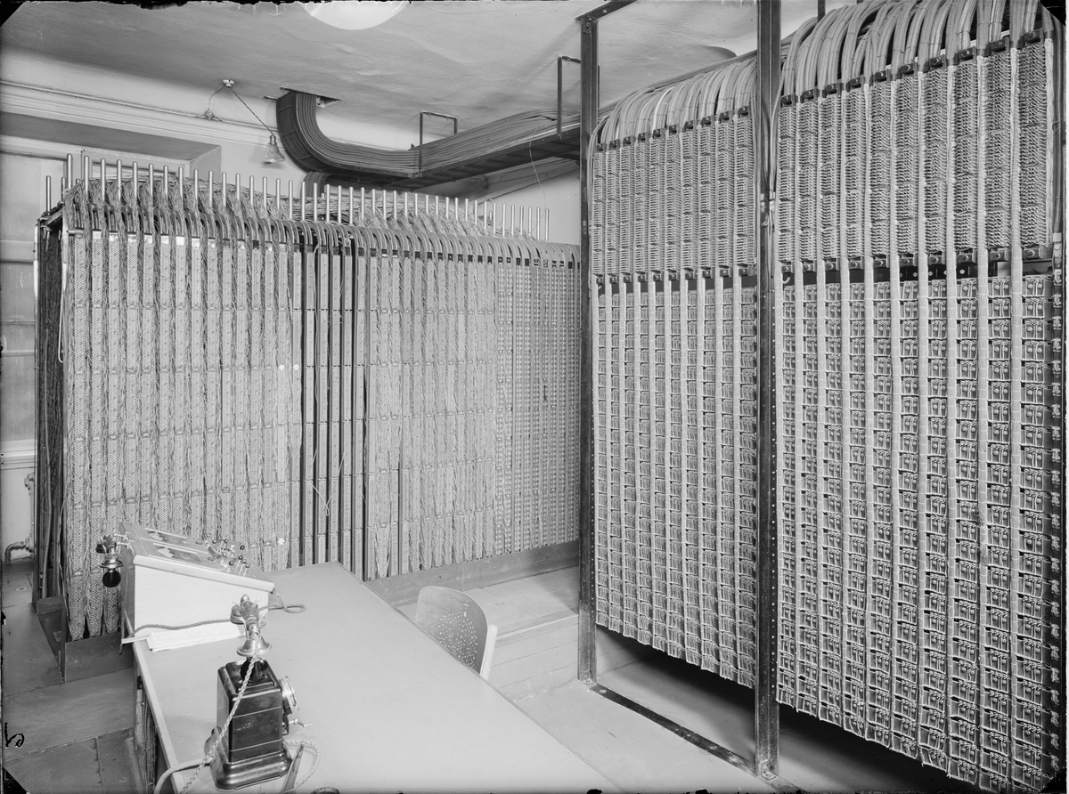 Gamla namnanropsstationen. Slottsbacken 8, Stockholm. Kopplingsstativ till höger och interurban- brytreläer till vänster.