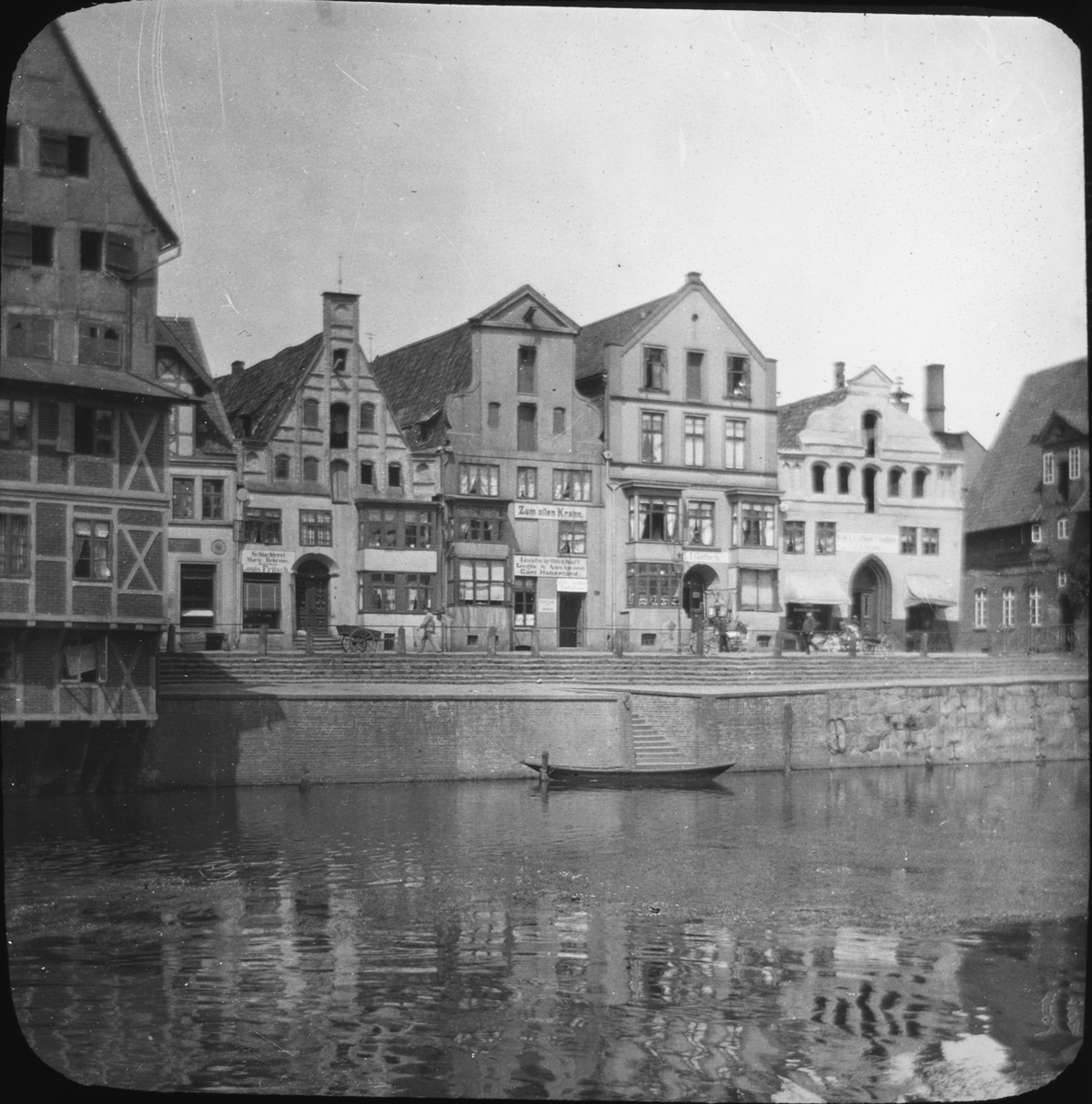 Skioptikonbild med motiv från Lüneburg. Hus vid ån Ilmenau.