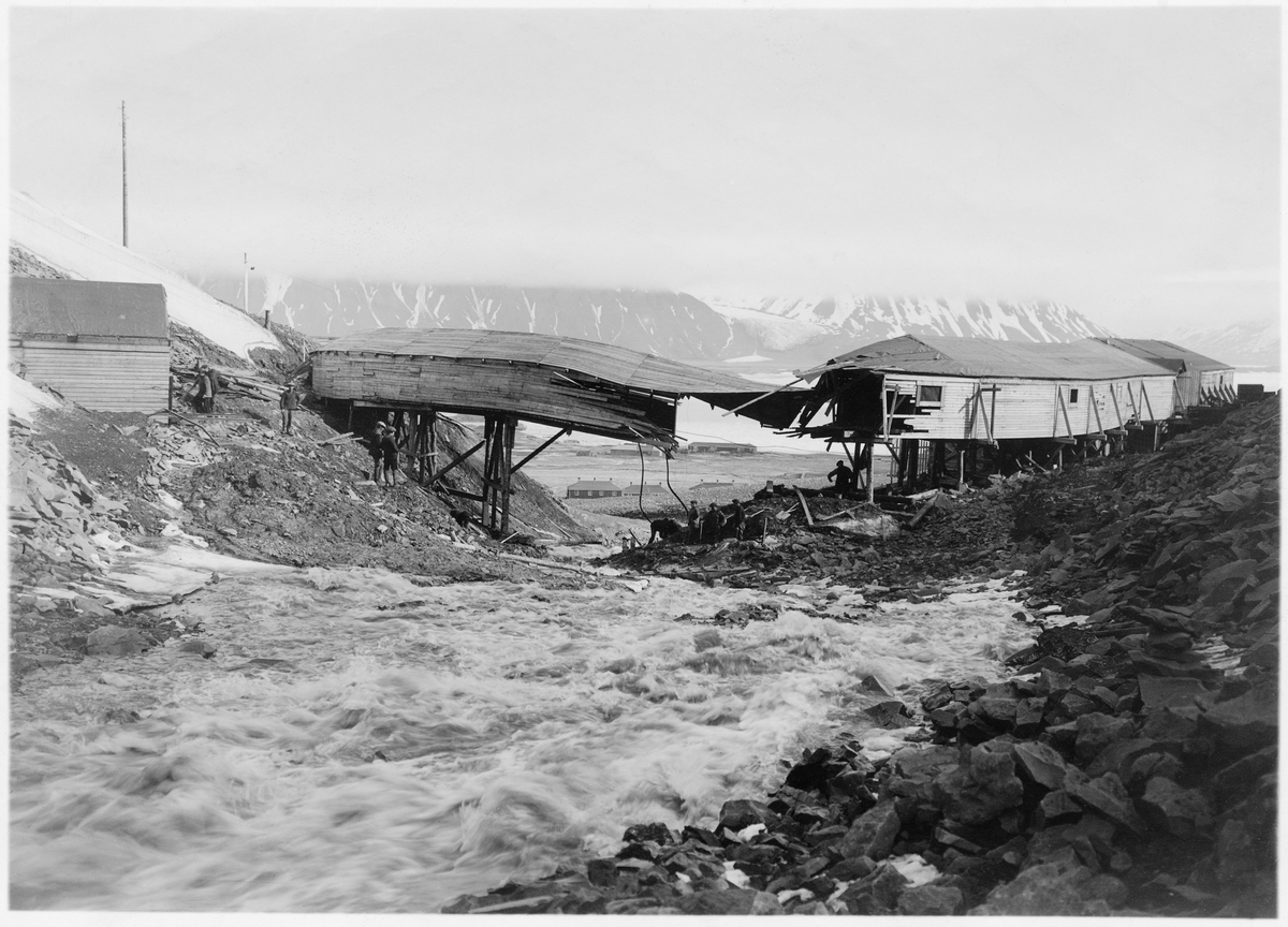 Sveagruvan på Spetsbergen. Uppdämd glaciärälv raserar galleriet.