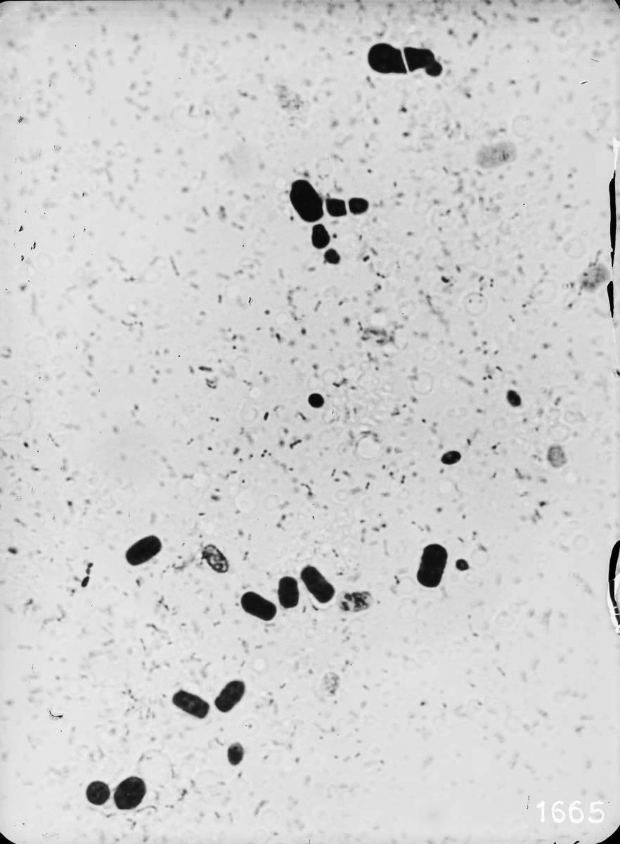 Mikrofotografering av mjölk. Mjölk förvarad 1 vecka i 20°C. Prov nr. 38.