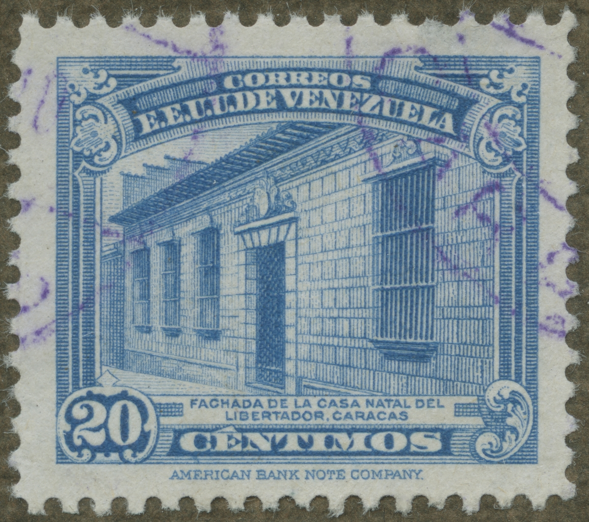 Frimärke från Venezuela, 1940. Motiv av Bolivars födelsehus i Caracas. "Simon Bolivar: 1783-1830. Sydamer. Frihetskämpe i striderna mot Spanien. 110-årsminne av Bolivars dör: 1830-1940".