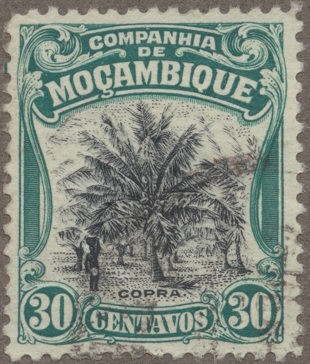 Frimärke från Companhia de Mocambique, Ostafrika, 1918. Motiv av copra ur kokosnötter för kokosfett.