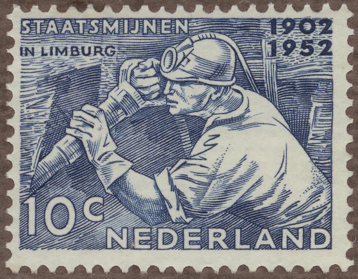 Frimärke från Nederländerna, 1952. Motiv av Gruvborrningsarbete i Limburg 50-årsminne: 1902-1952.
