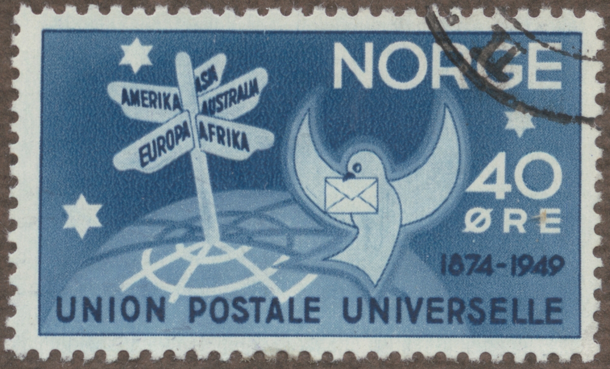 Frimärke från Norge, 1949. Motiv av Brevduva på jordglob- vägvisare med nationsnamn- stjärnor. -Symboler för världspostbefordran -75-årsminne av Världspostföreningen 1874-1949-