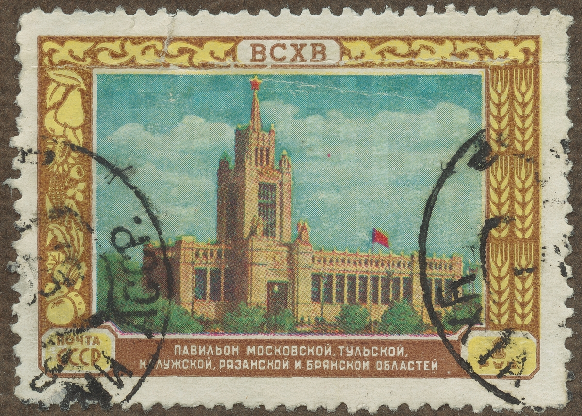 Frimärke från Ryssland, 1956. Motiv av Utställningspaviljongen för Moskwa Tula Kaluga, Rjansj, Briansk Lantbruks och trädgårdssymboler