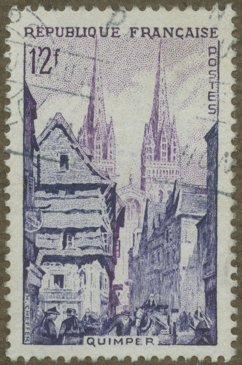 Frimärke från Frankrike, 1954. Motiv av gamla byggnader och Domen i Quimper. Deptmt. Finisterre i södra Bretagne.
