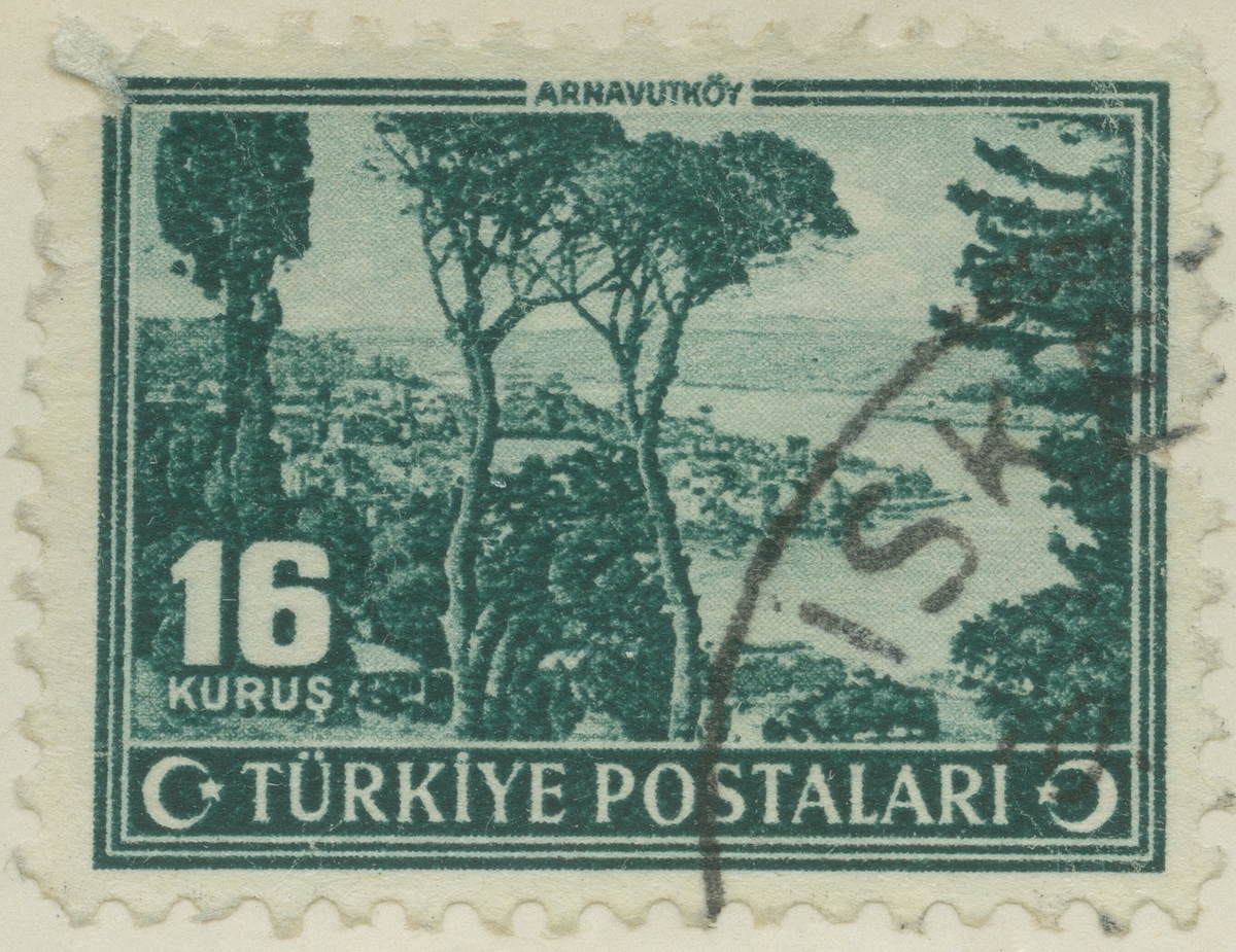 Frimärke ur Gösta Bodmans filatelistiska motivsamling, påbörjad 1950. Frimärke från Turkiet, 1943. Motiv av Albanisk by: Arnavutköy "nära Bosporen sundet"