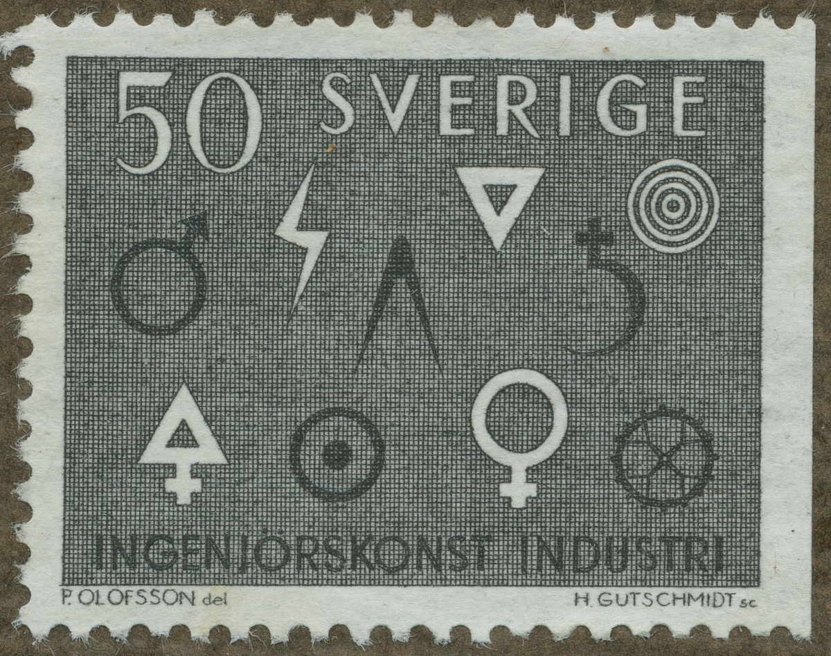 Frimärke ur Gösta Bodmans filatelistiska motivsamling, påbörjad 1950. Frimärke från Sverige, 1963. Motiv av Passare "och andra 3000-år gamla symboler för svensk industri och ingeniörskonst. Passaren är symbol för geometri, ingenjörkonst och arkitektur."