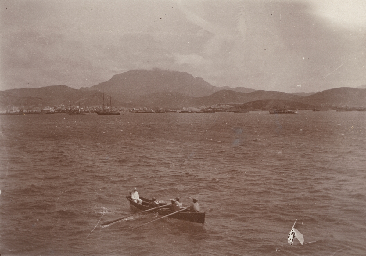 Fotografi från första svenska Antarktisexpeditionen 1901-1904. Motiv av män i en roddbåt nära en hamn.