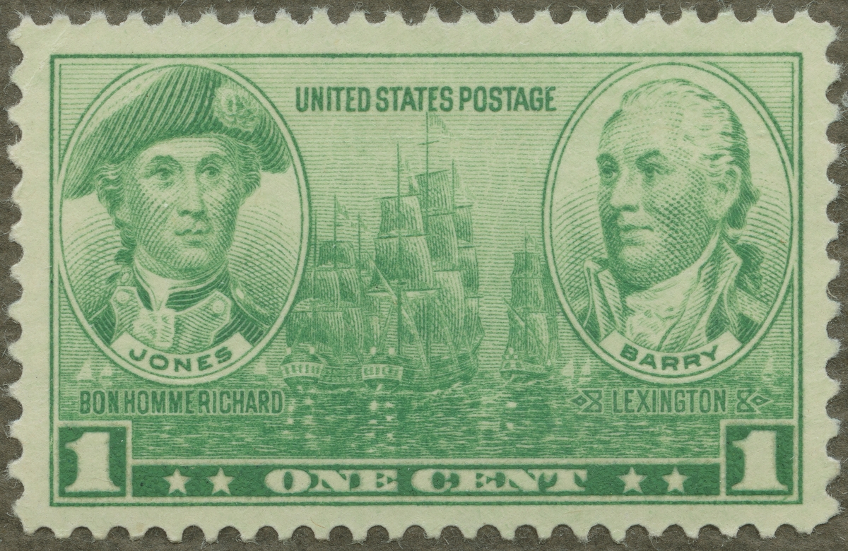 Frimärke från U.S.A., 1936. Motiv av Tre krigsfregatter för fulla segel: 1700-talet. (t.v.): Kapt. John Paul Jones och hans fartyg: "Bonhomme Richard" (1747-1793) (t.h.): Kapt. John Barry och hans fartyg: "Lexington". - sjöhjältar under amerikanska frihetskriget 1775-1782.- Serien: "Arméen och Marinen"-