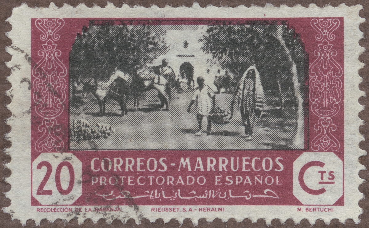 Frimärke från Spanska Marocko, 1944. Motiv av apelsinskörd.