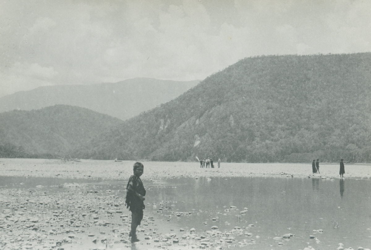 Fotografi från expedition till Peru 1920. Motiv av pojke stående i sumpig mark. I bakgrunden syns berg och djungel och ett antal expeditionsdeltagare.