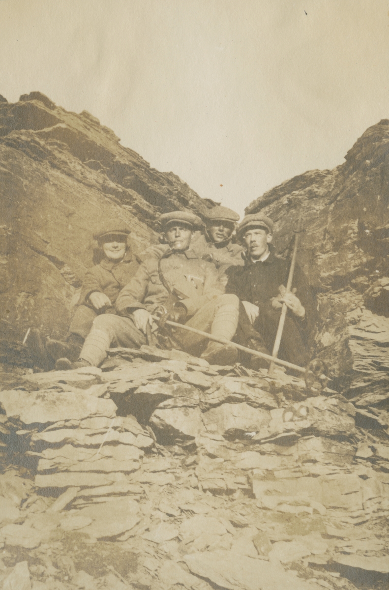 Fotografi från expedition till Spetsbergen. Motiv av fyra män på vandring i bergen.