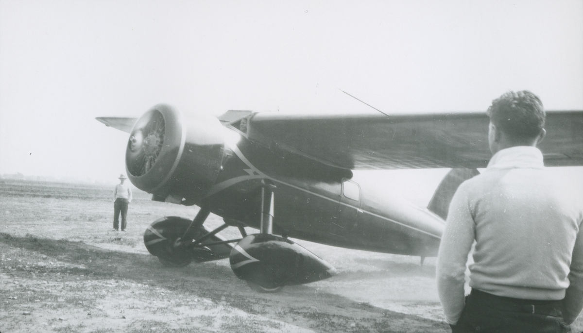 Fotografi från låda märkt Bernt Balchen. Balchen var norsk-amerikansk flygare, polarforskare och militär. Motiv av två män som står och tittar på ett flygplan.