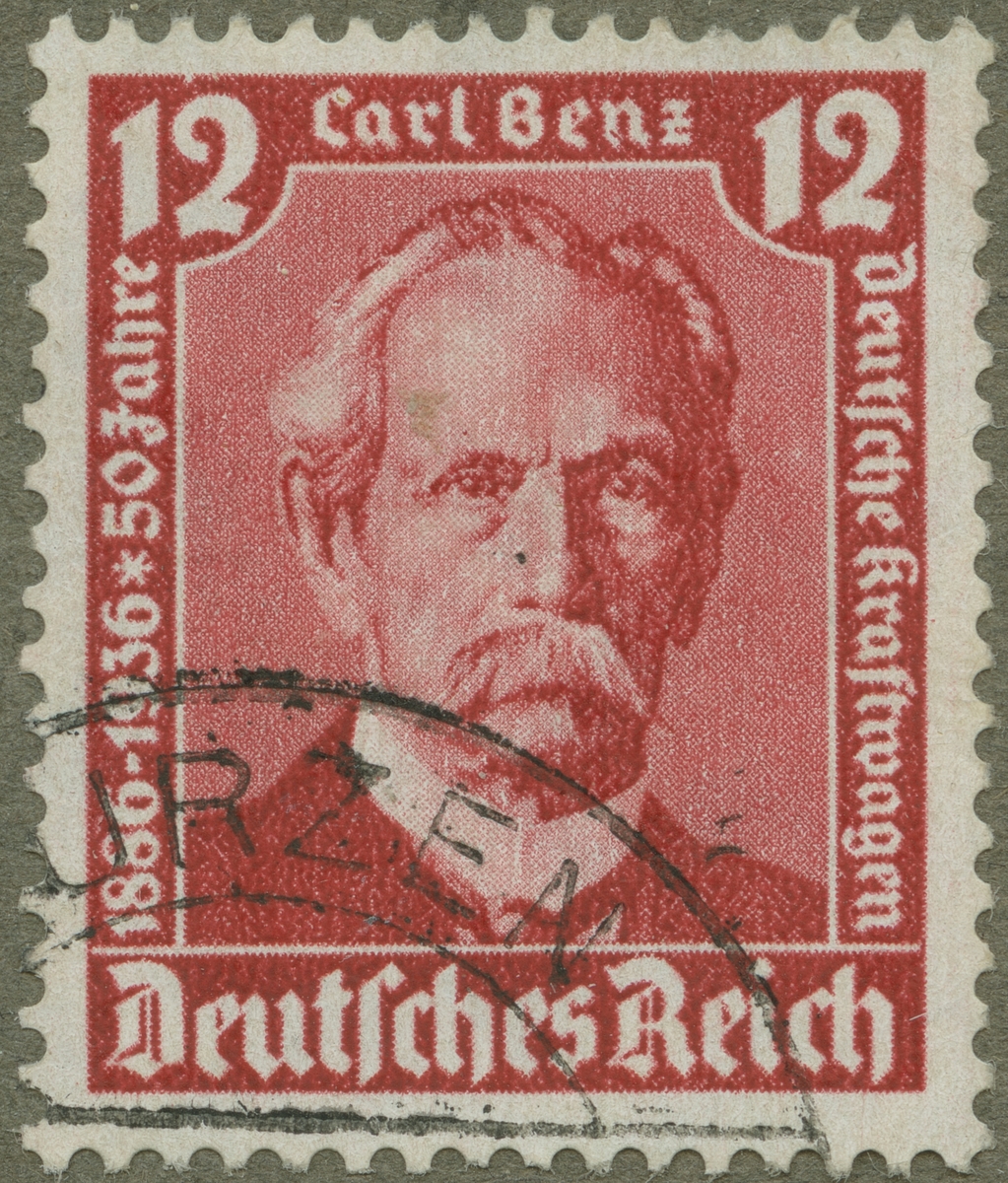 Frimärke från Tyskland, 1936. Motiv av Carl Benz. Tysk ingeniör. Byggde det första på ett självständigt sätt konstruerade fordonet med bensinmotor. 1886. 50-årsminne av den tyska bilen. 1886-1936.