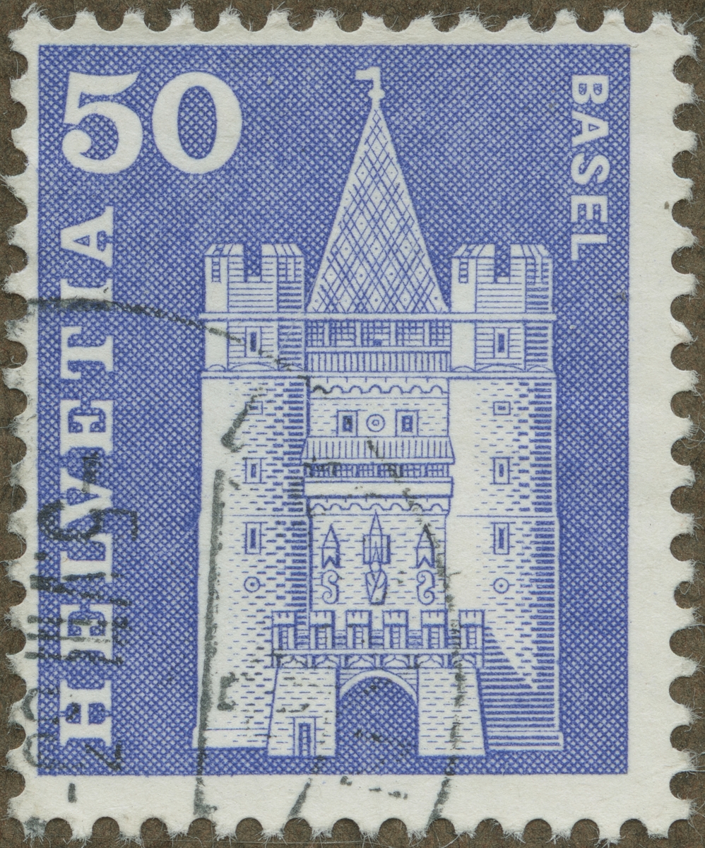 Frimärke från Schweiz, 1960. Motiv av Stadsbild från Basel, stadsporten Spalentor.