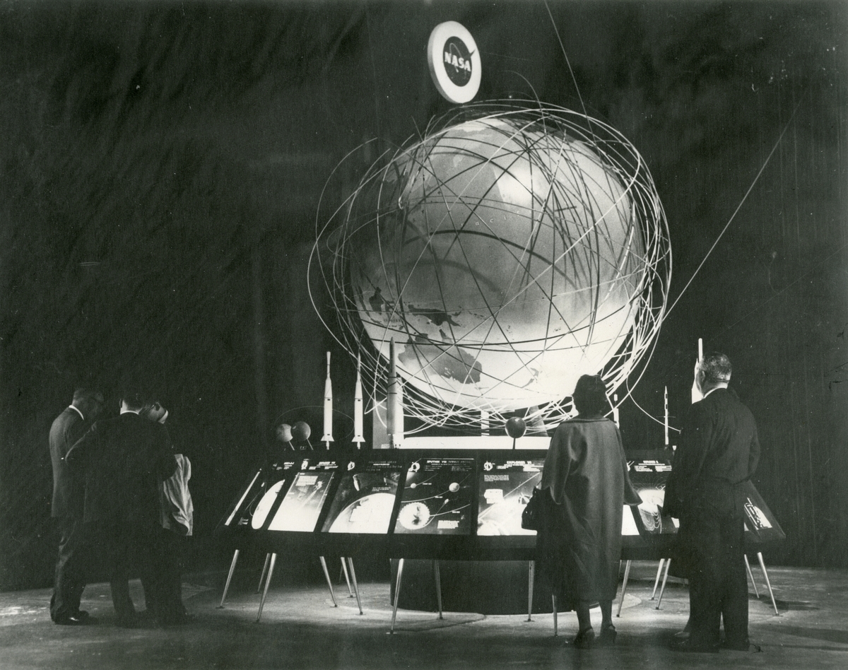 Okänd rymdutställning. Runt jorden är banor utlagda för en del av USA.s saterliter.