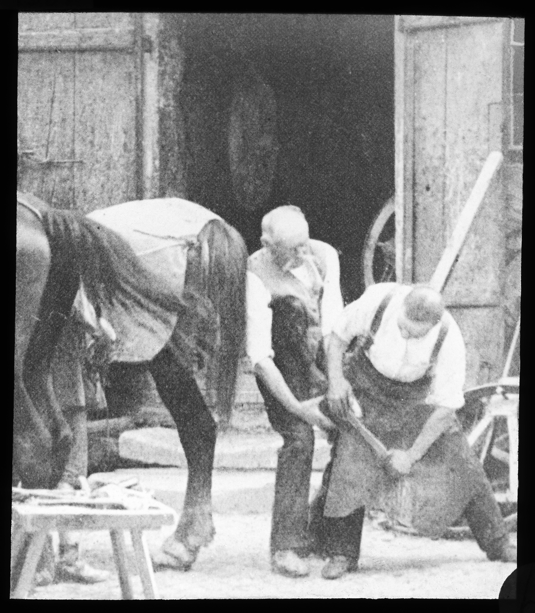 Skioptikonbild från institutionen för fotografi vid Kungliga Tekniska Högskolan. Använd av professor Helmer Bäckström som undervisningsmaterial. Bäckström var Sveriges förste professor i fotografi vid Kungliga Tekniska Högskolan 1948-1958. Hovslageri. Bilden visar beskärningsteknik. Se bild SKC7586.Se Fotografisk Handbok av Helmer Bäckström. Natur och Kultur. Andra omarbetade upplagan 1958-59. Kap. 123. Bildproportioner och bildbeskärning. (Bilden är en reproduktion.)