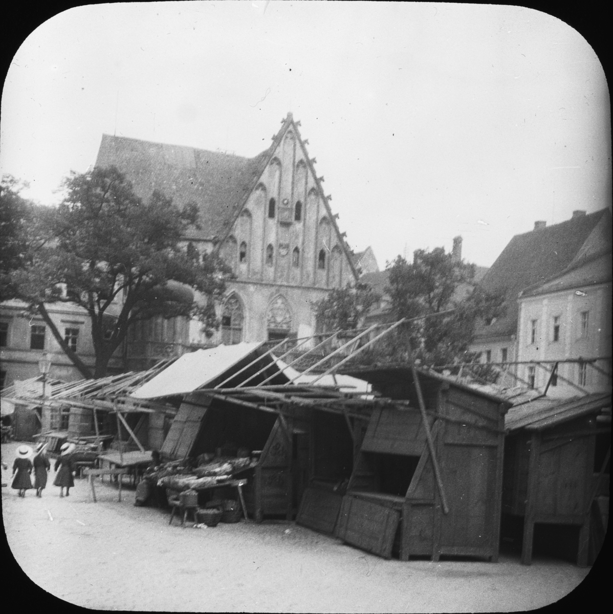 Skioptikonbild med motiv av marknadsstånd på torget framför rådhuset i Amberg.