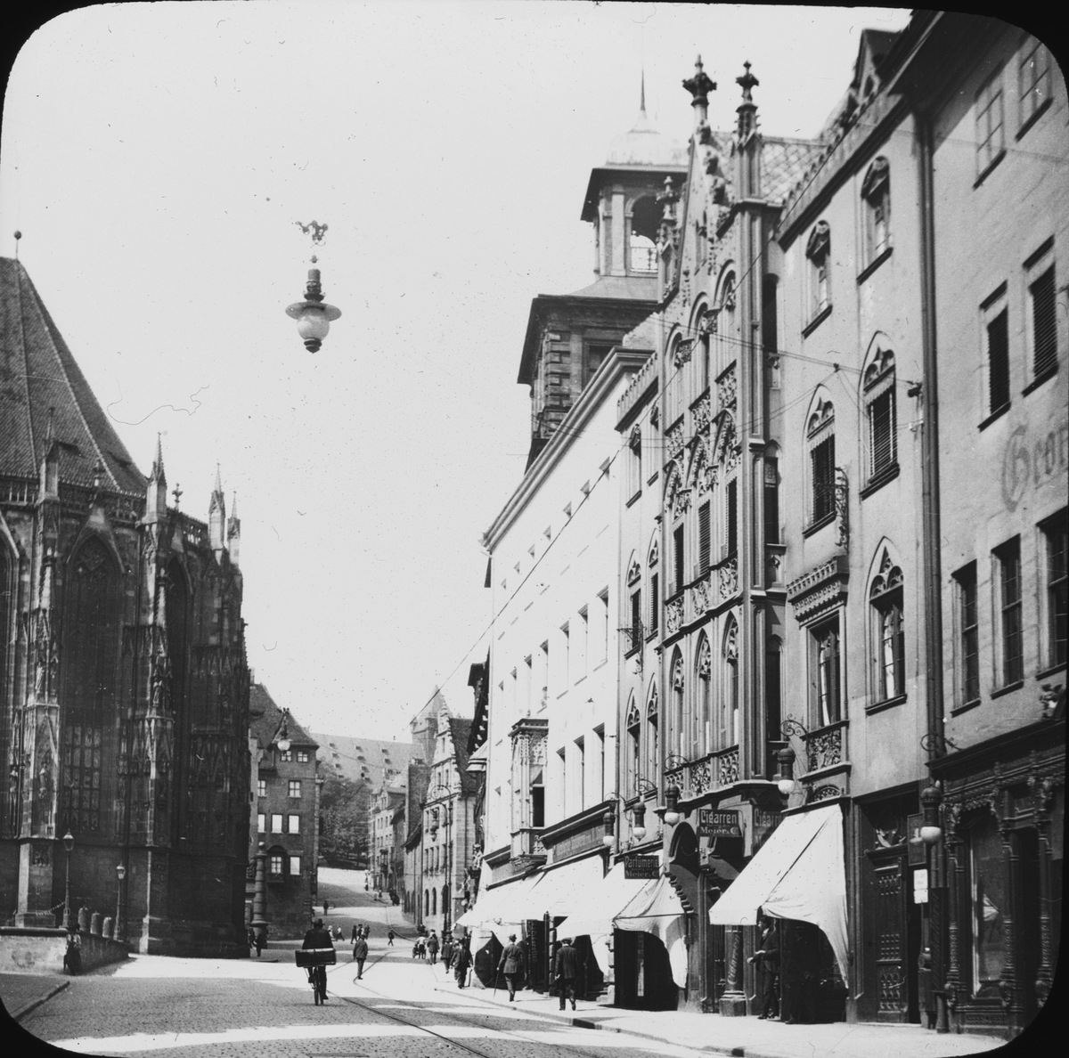 Skioptikonbild med motiv av gatan Burgstrasse i Nürnberg. Vid sidan skymtar St. Sebalduskirche.