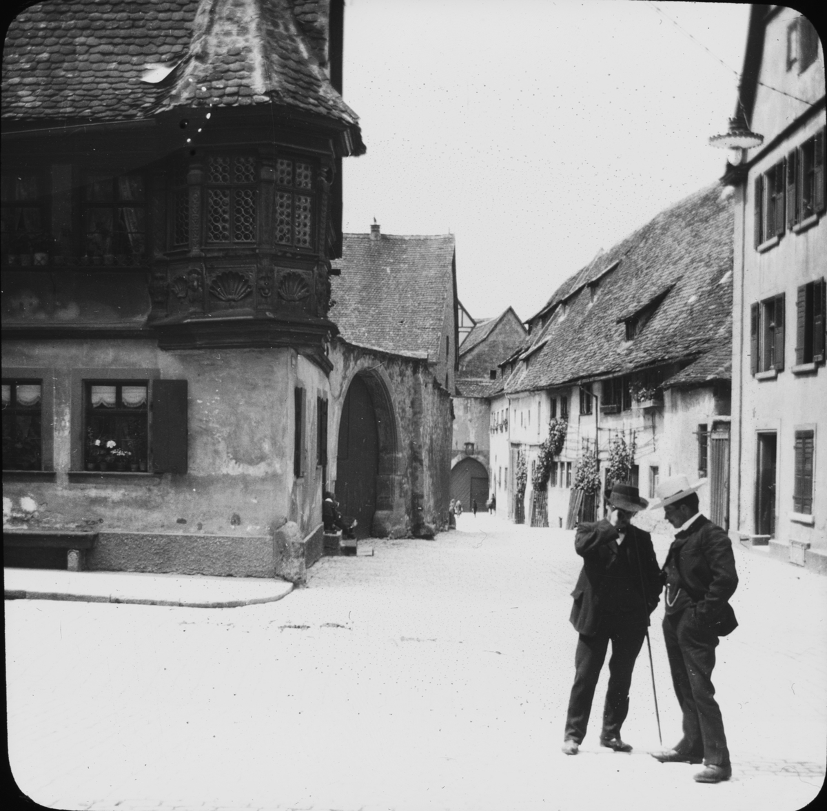 Skioptikonbild med motiv av två språkande män på gata, Klingen Strasse, i Rothenburg.