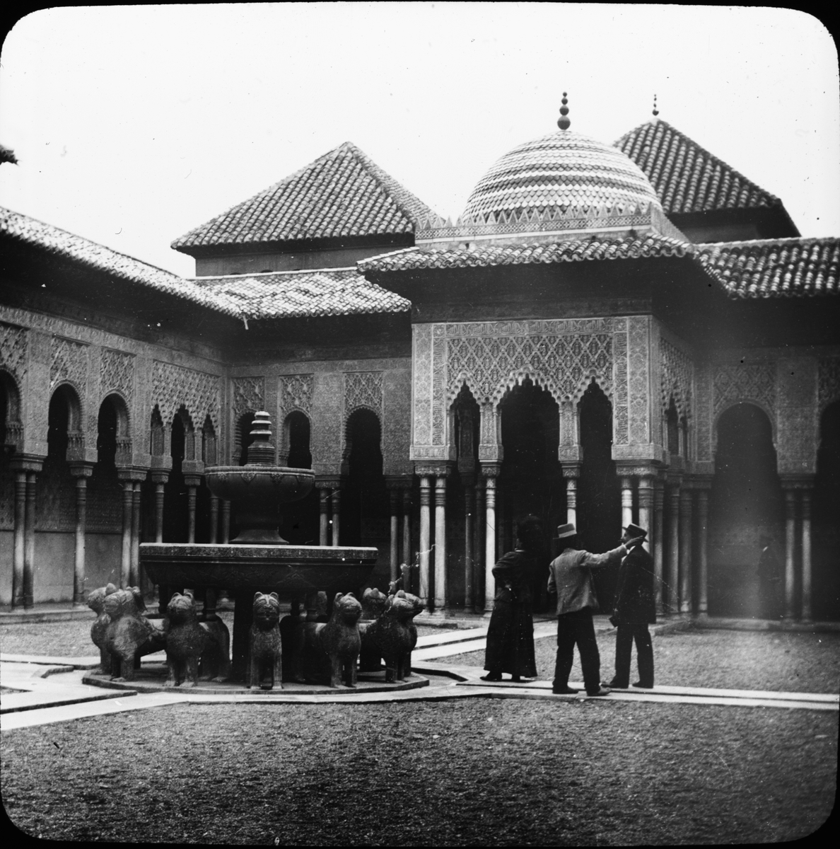 Skioptikonbild med motiv från slottsgården, Alhambra med lejonfontänen Patio de los Leones.