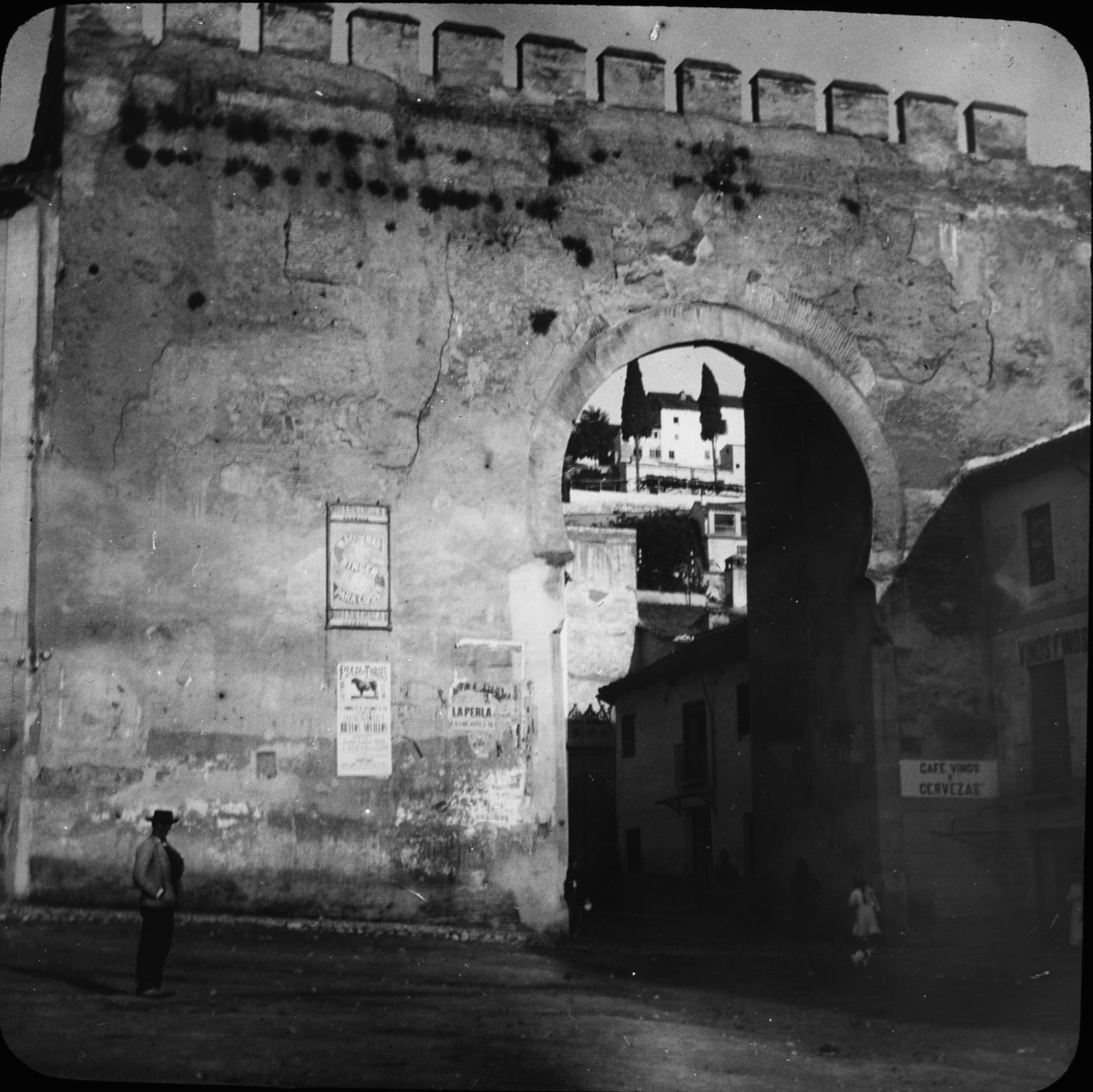 Skioptikonbild med motiv av valvporten Puerta de Elvira, Albaicin, Granada.