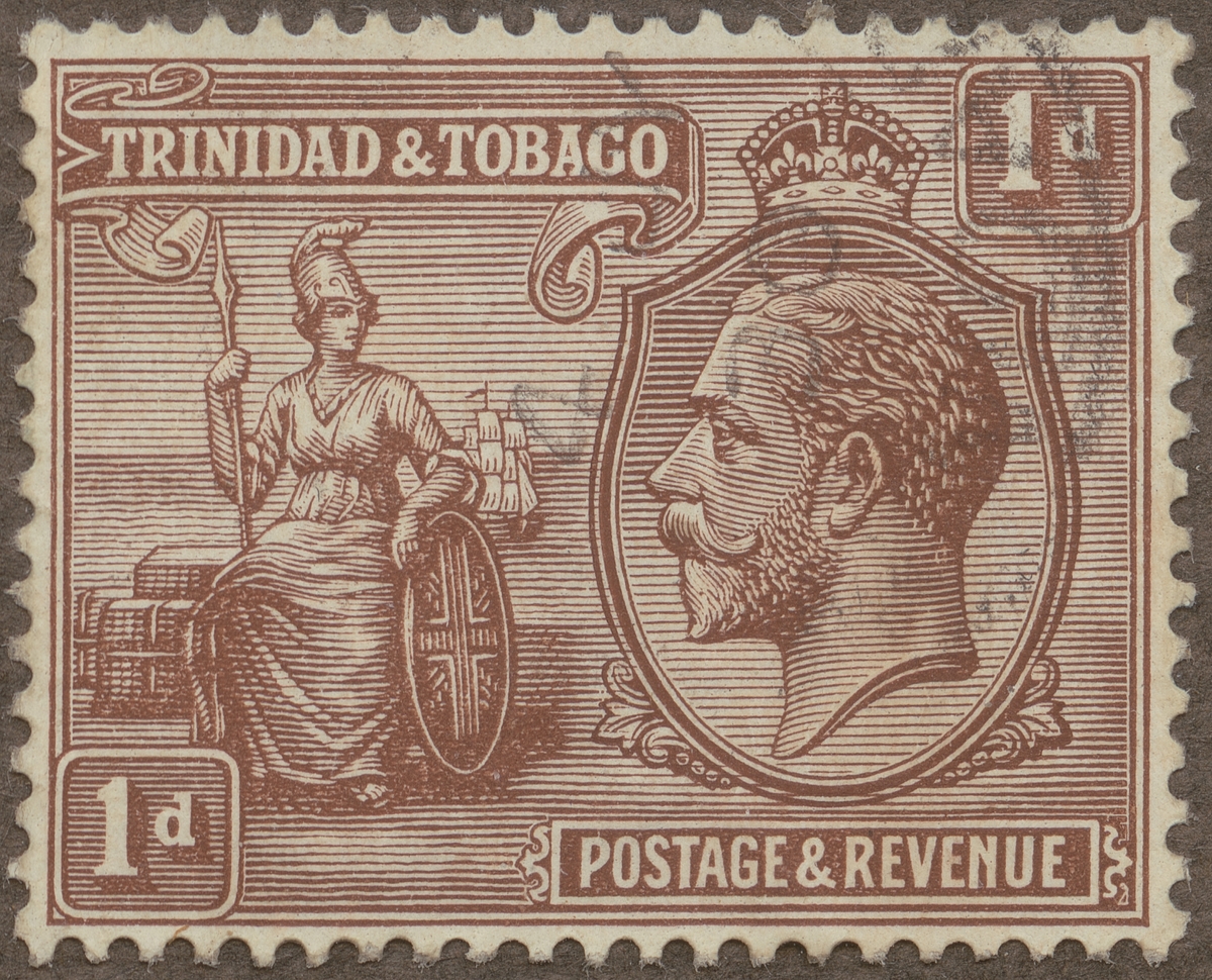 Frimärke från Trinidad & Tobago, 1922. Motiv av Symbol för sjöfart och handel. Trinidad, Västindien. -"Brittania" och Kung George V-