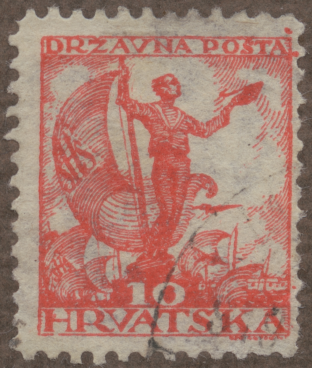 Frimärke från Jugoslavien, 1919. Motiv av Fartyg med flagga Kroatien